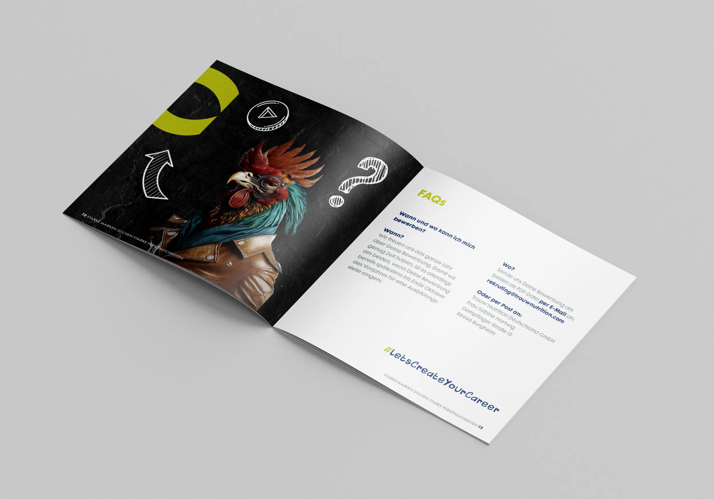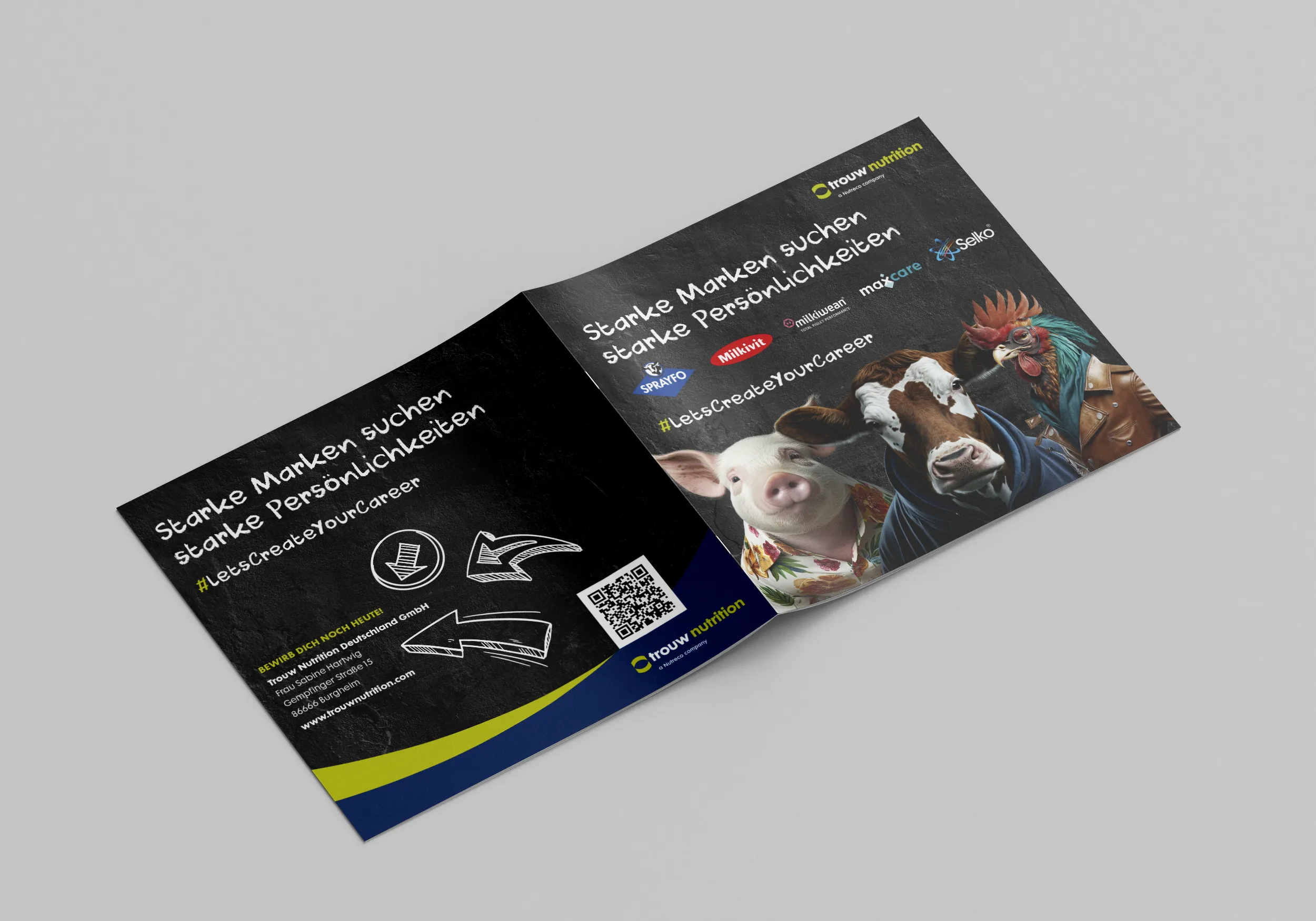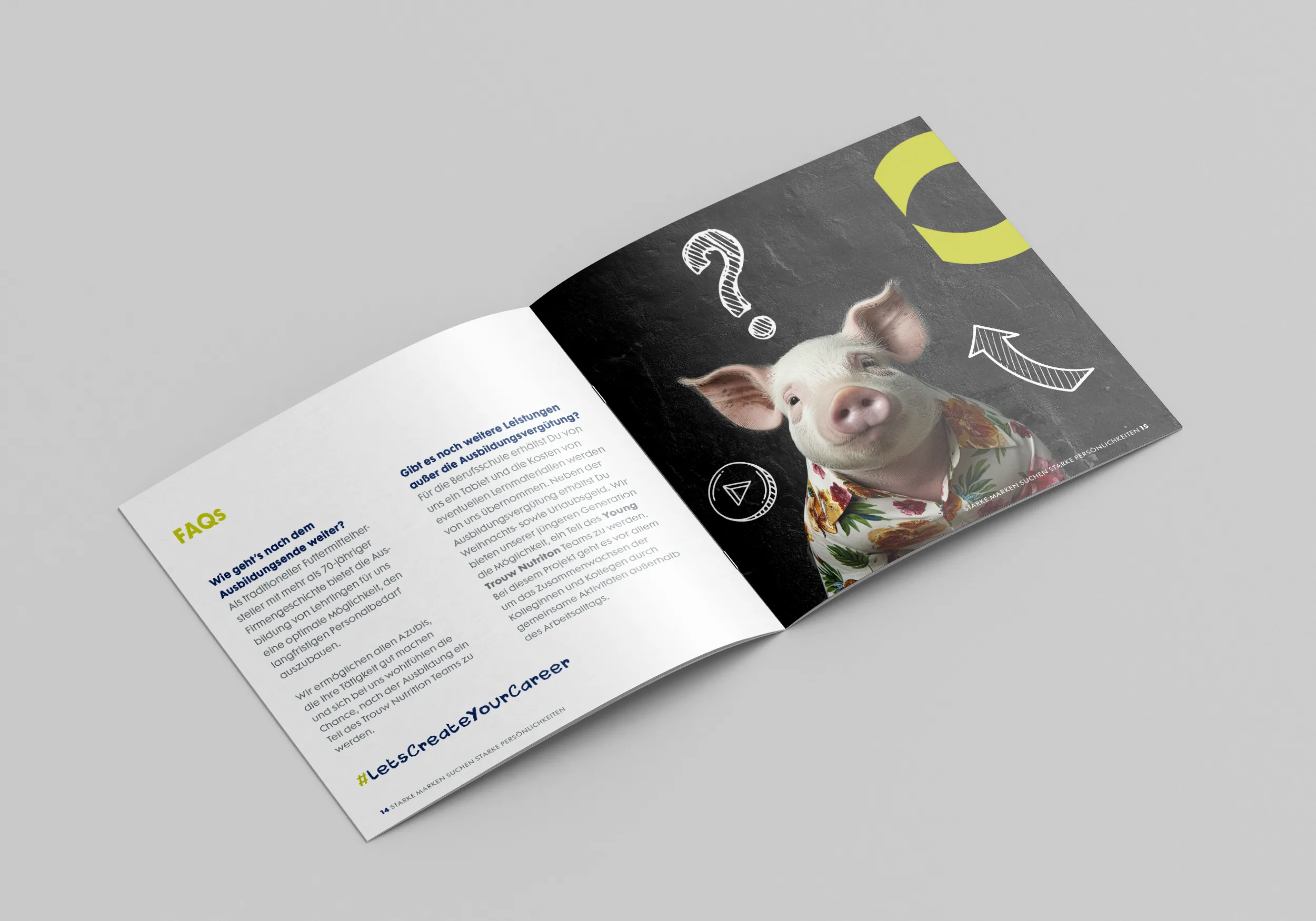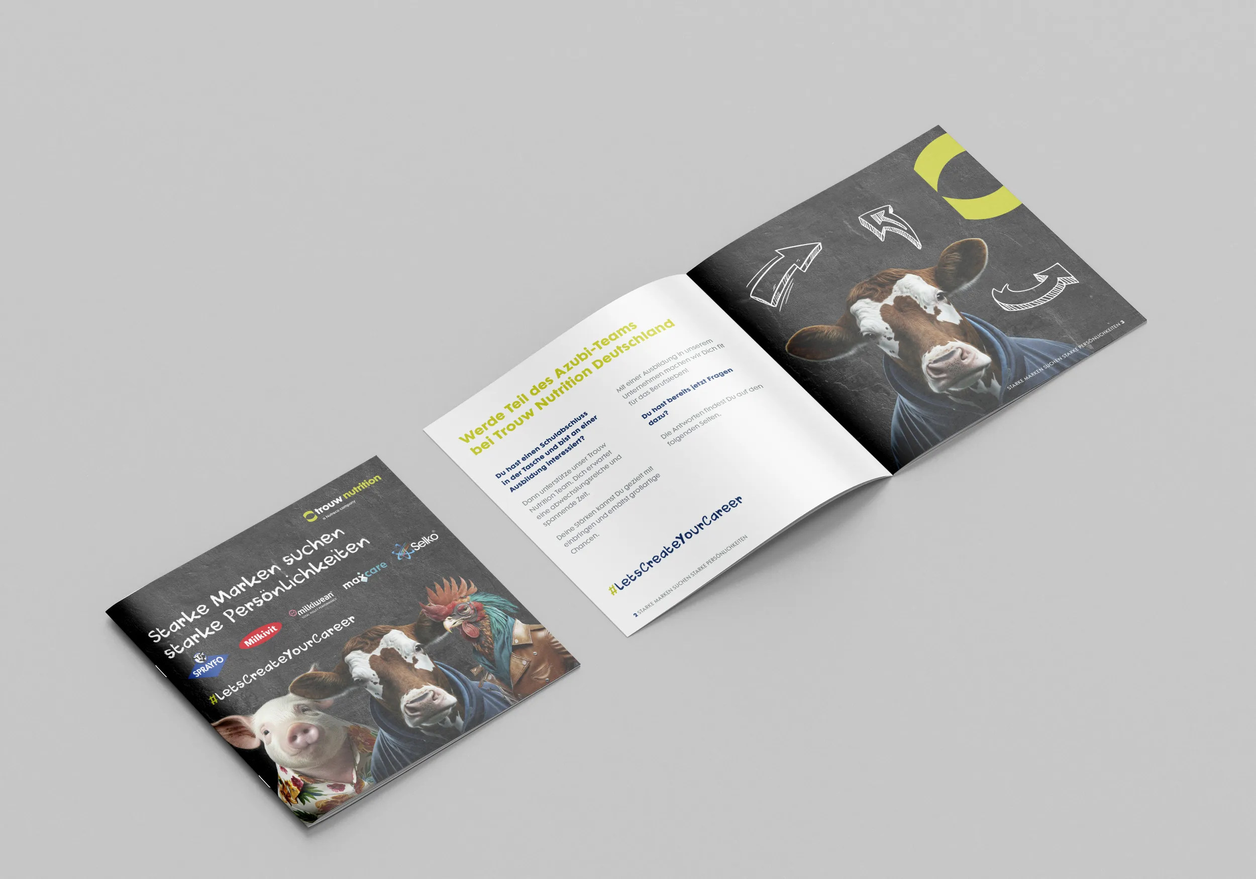Unser langjähriger Kunde Trouw Nutrition Deutschland GmbH beauftragte uns mit der Konzeption, inhaltlichen Ausarbeitung sowie der gestalterischen Umsetzung einer 20-seitigen Azubi-Broschüre mit dem Titel „Starke Marken suchen starke Persönlichkeiten.“